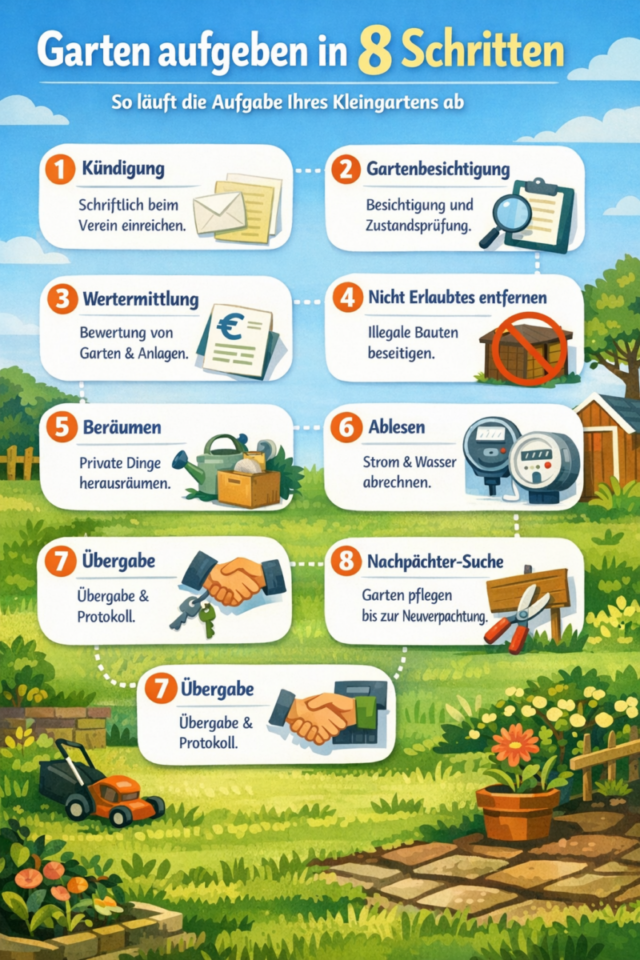 Wenn Sie, aus welchen Gründen auch immer, ihren geliebten Garten wieder aufgeben müssen, haben wir Ihnen hier die 8 wichtigsten Schritte zusammengefasst: